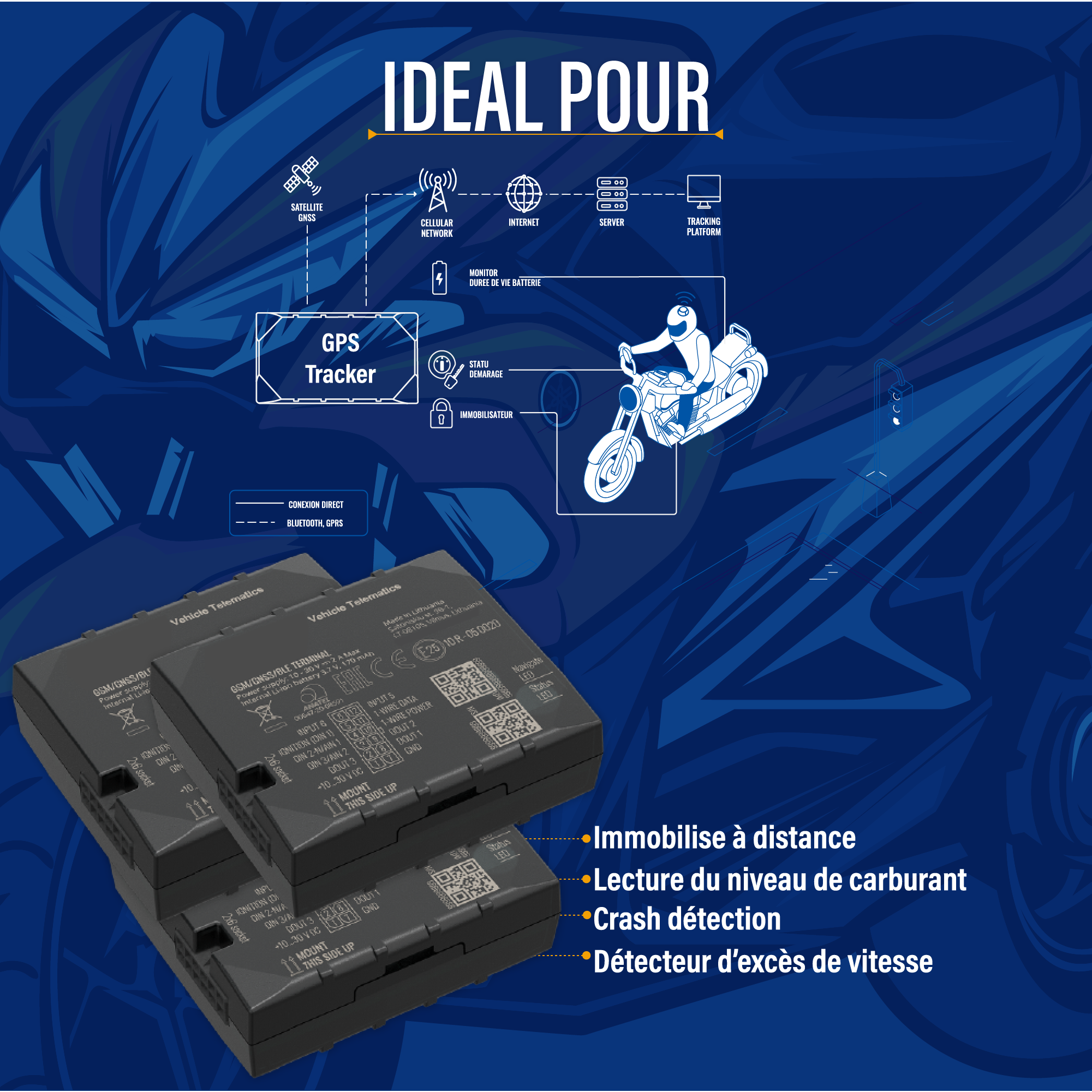 Module GSM 3G avancé, Bluetooth Low Energy, Antenne GNSS, Mémoire interne de 128MB, Batterie interne, Interfaces d'entrées analogiques et de sorties numériques.